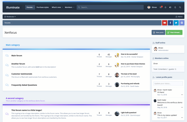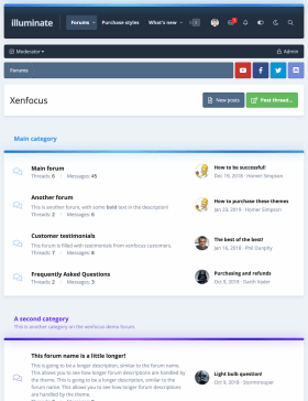 illuminate is a minimal, modern theme for xenforo 2. A compact, dark header neatly contains your logo, navigation, a fluid search bar and user icons - while your main content is placed on a simple background for easy reading. Categories can be styled with their own unique colour scheme which is especially great for sports teams, brands, games or movies.